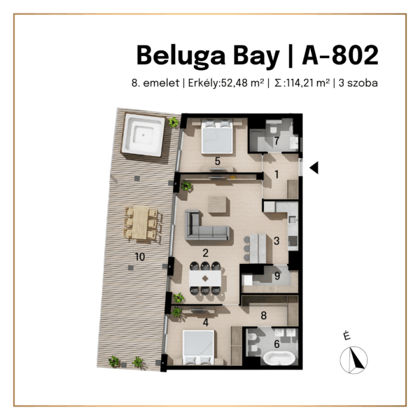 - A terasz 52,5 m² saját kültéri tér, ahová akár jakuzzi is kihelyezhető.
