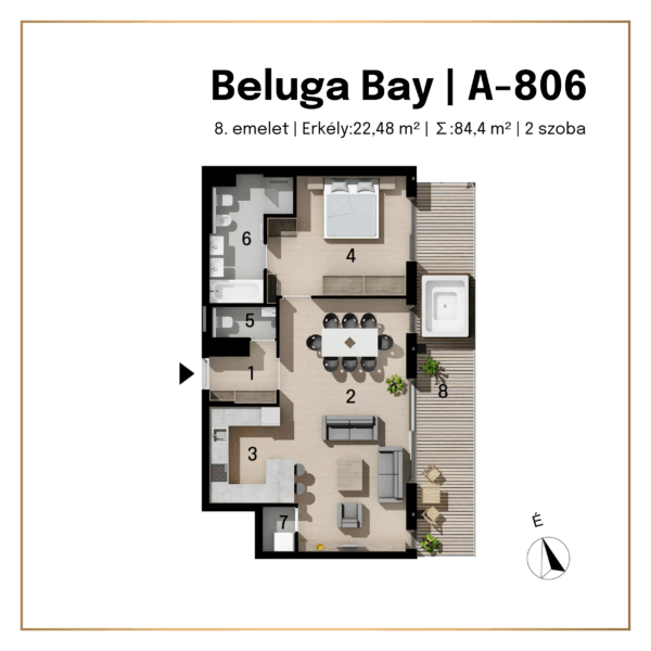 Eladó ez a 84 m²-es, világos, praktikus kialakítású lakás a Beluga Bay exkluzív lakóparkjának nyolcadik emeletén. A 22,5 m²-es terasz tökéletes helyszín a reggeli kávézáshoz vagy az esti borozáshoz.